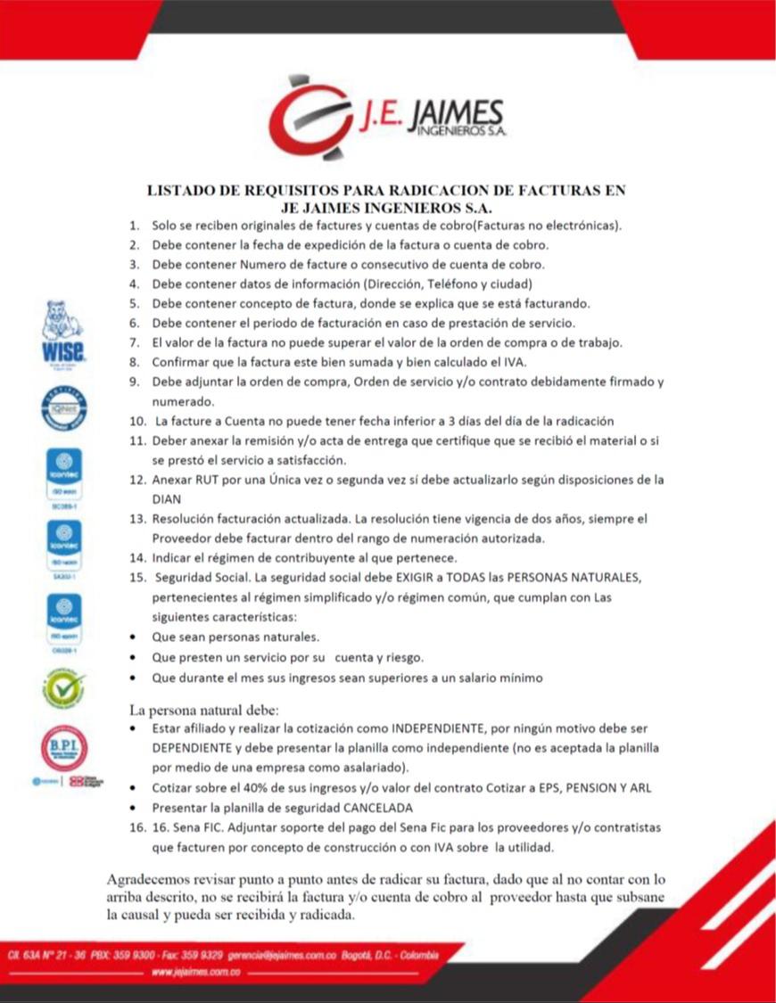 Agradecemos revisar punto a punto antes de radicar su factura, dado que al no contar con lo descrito a continuación, no se procesará la factura y/o cuenta de cobro al proveedor hasta que subsane la causal y pueda ser recibida y radicada.